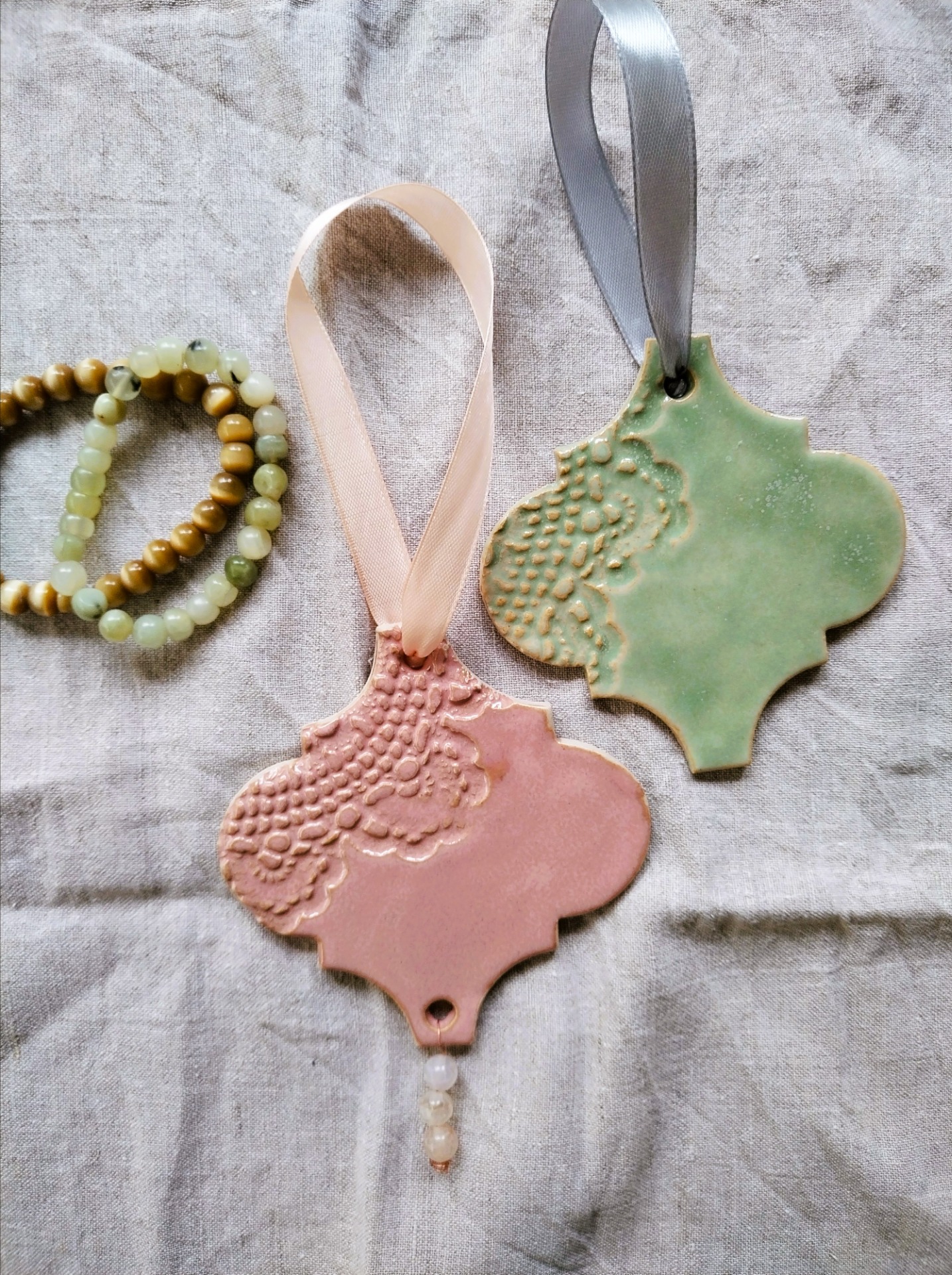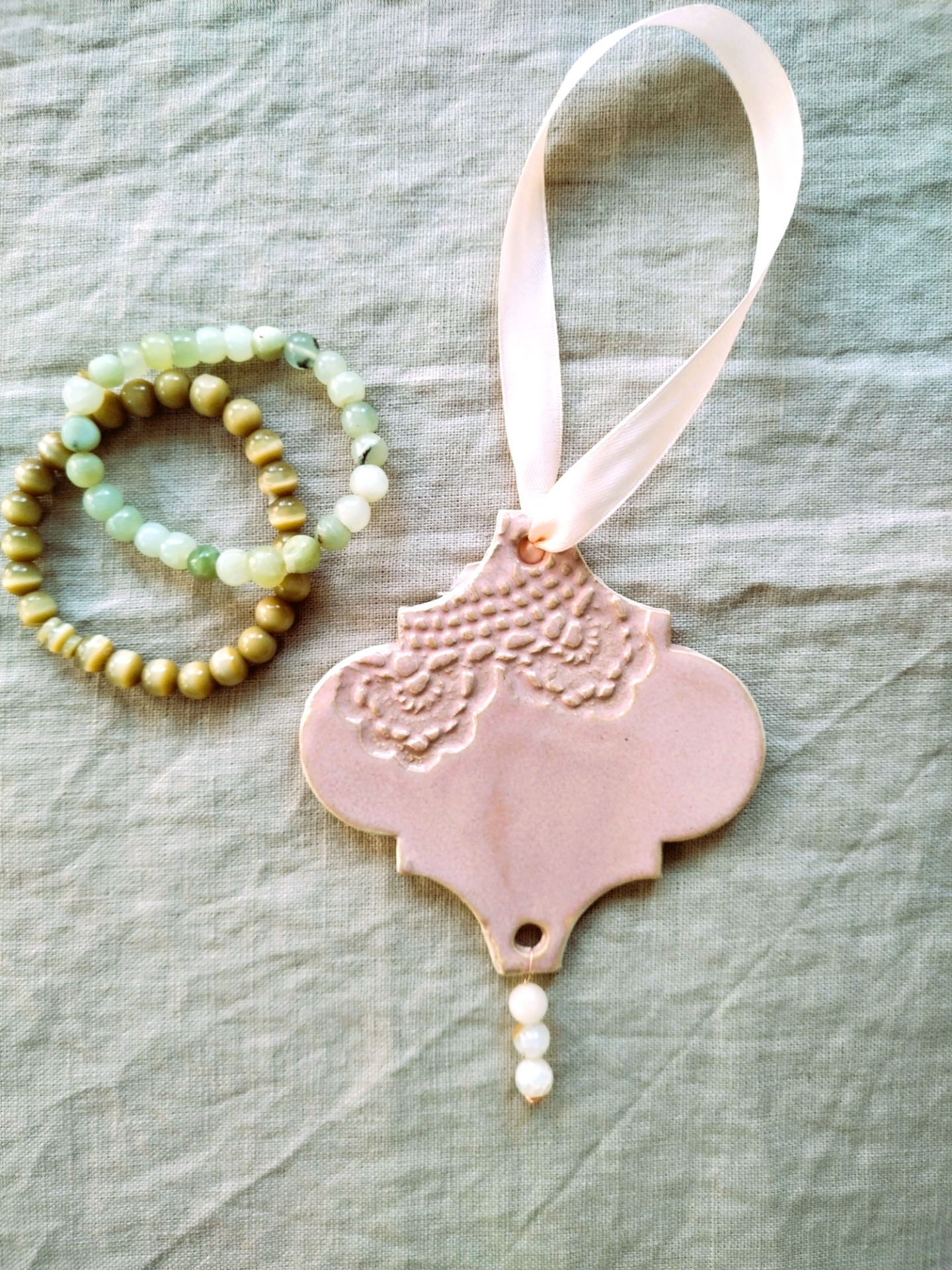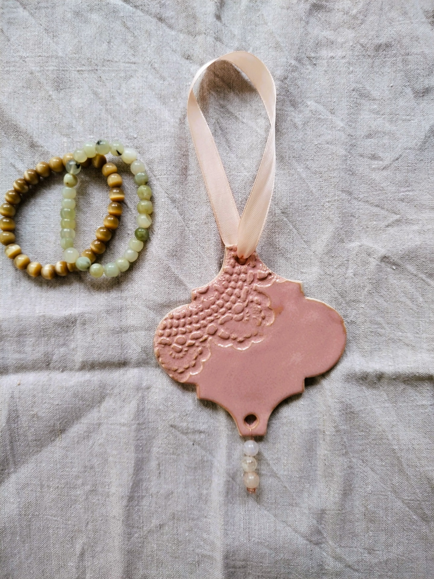 Ketunpesän, käsintehty joulukoriste vuodelta 2023. Helmiriipuksena aidot ruusukvartsit.