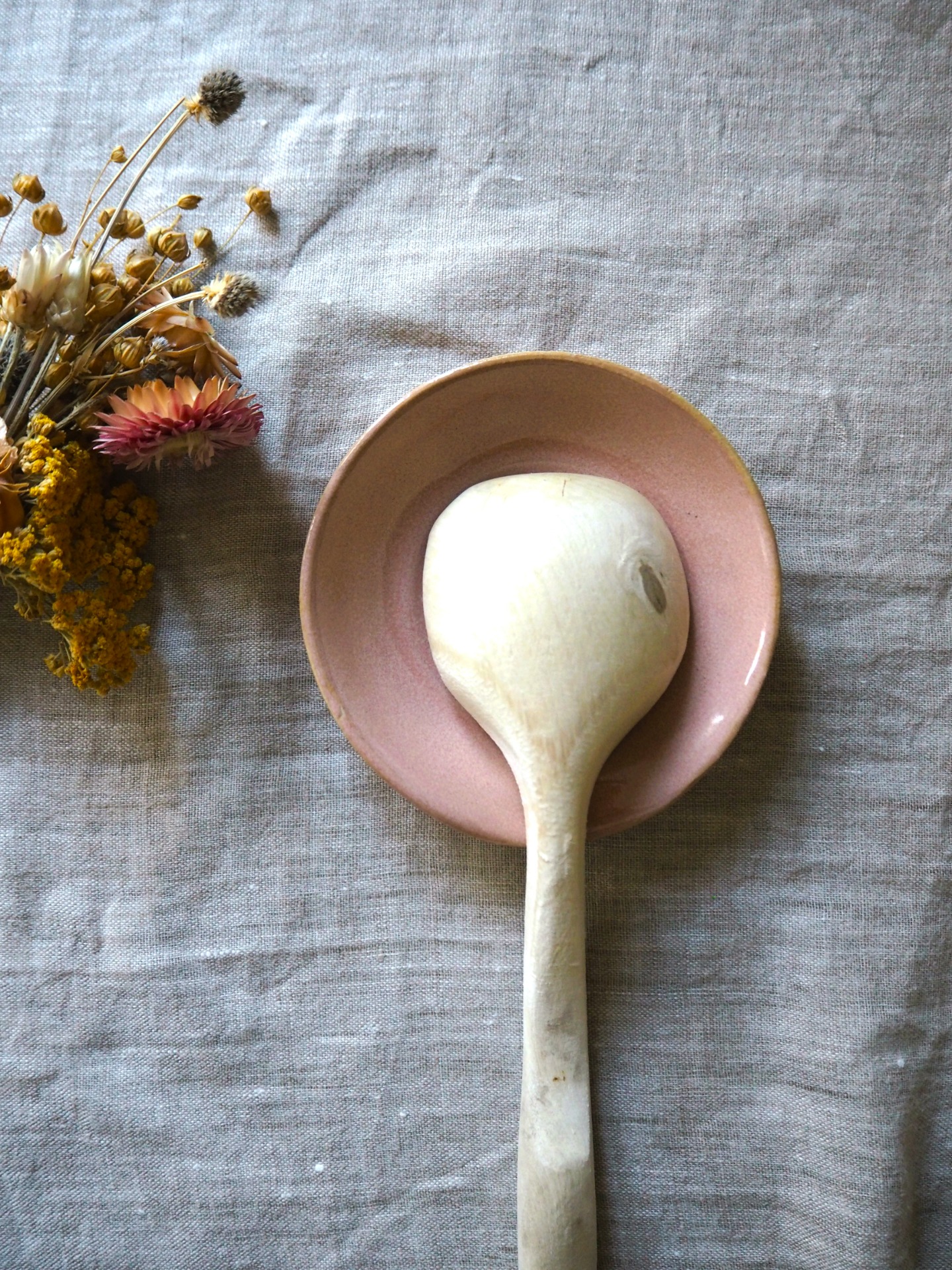 Vadelmaisen vaaleanpunainen alusta kauhalla kattilan viereen.