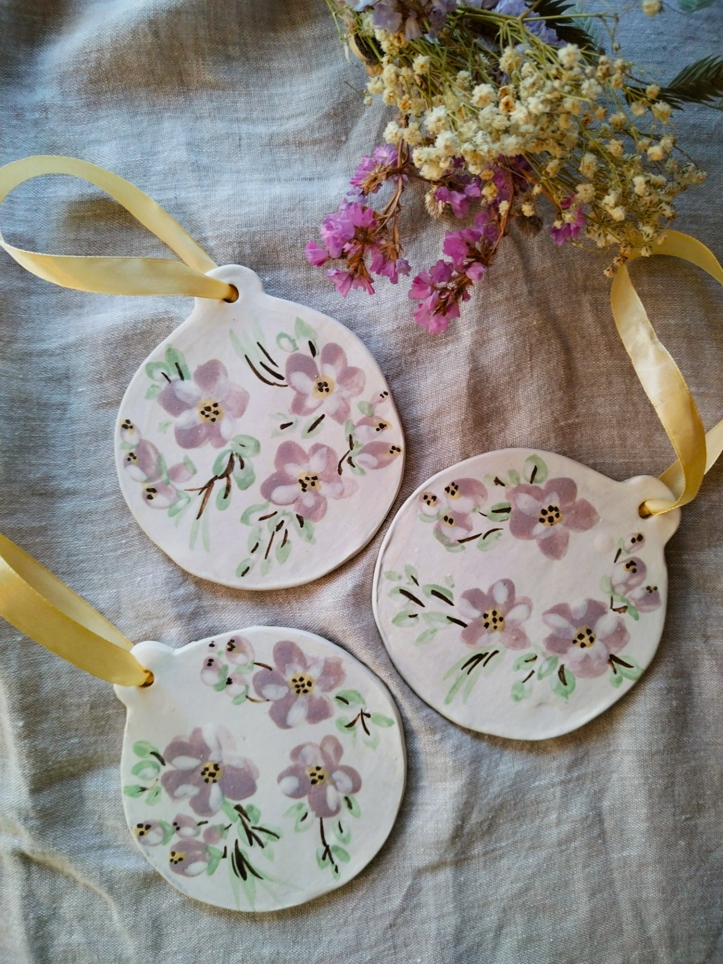 Ketunpesän, käsintehty ja -maalattu kukkakoriste. Koristeen lasite on himmeä ja hieman karkea