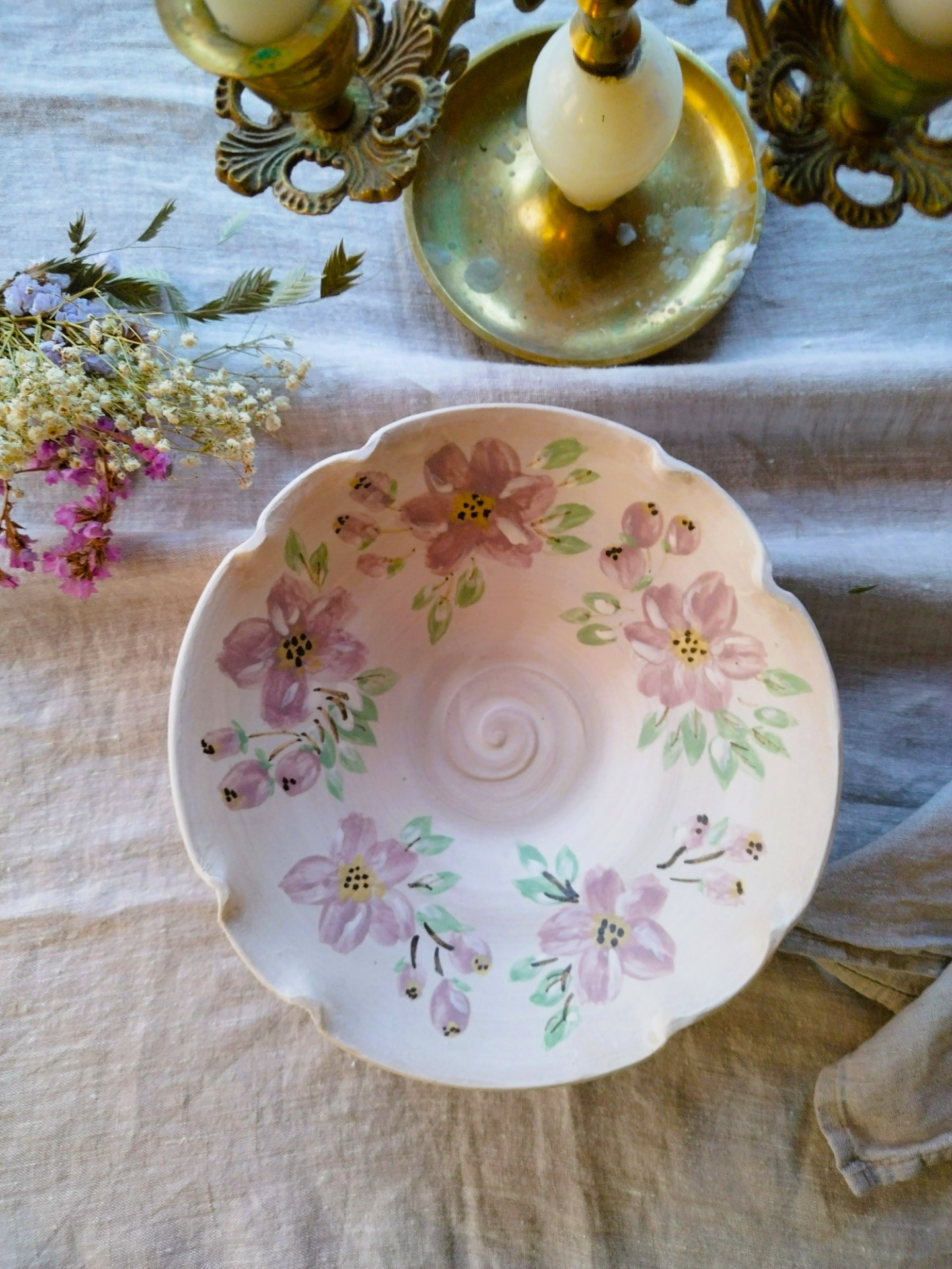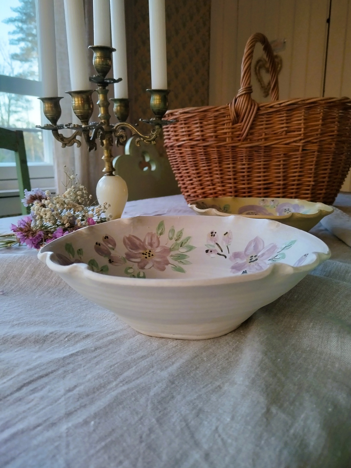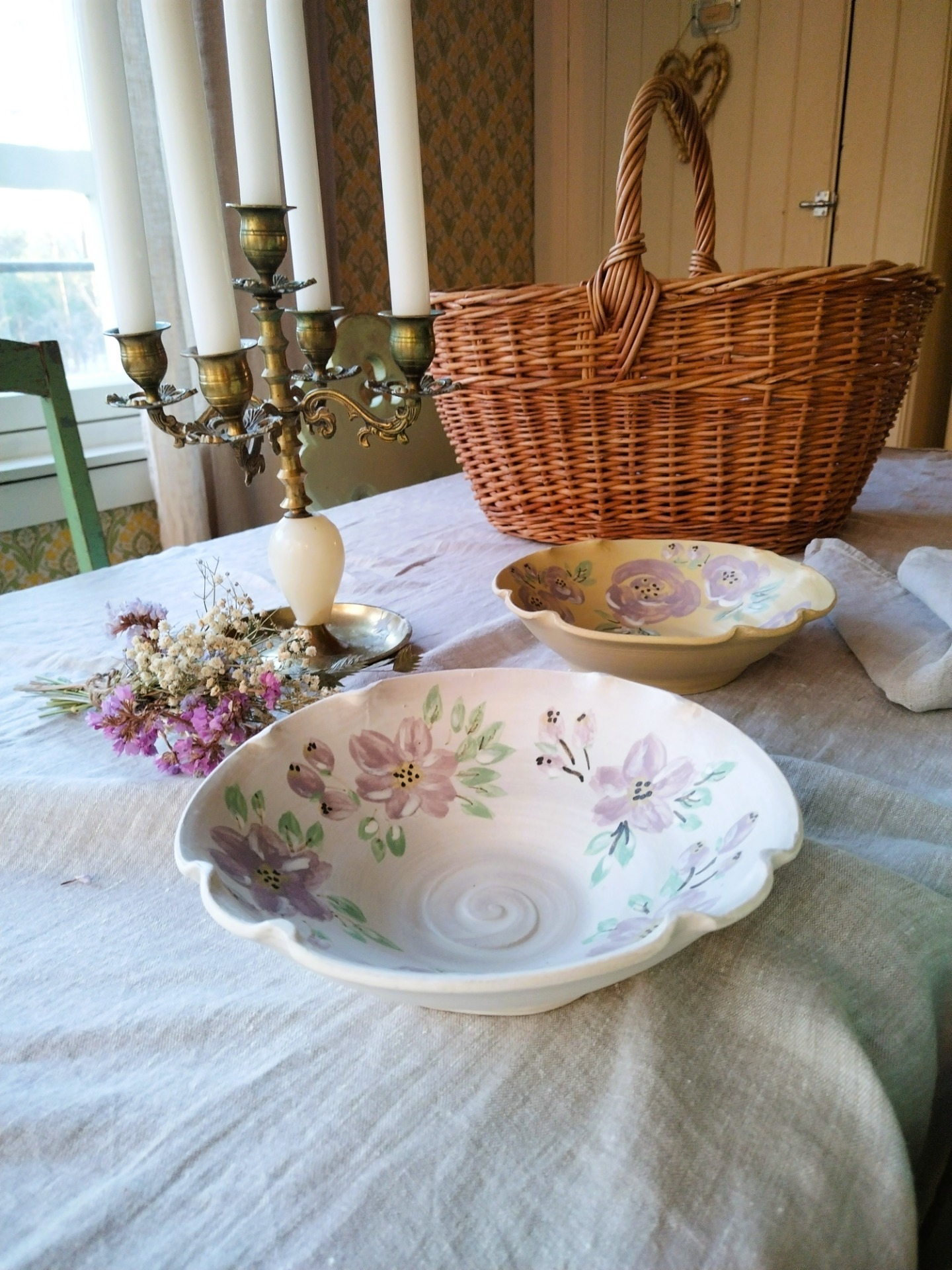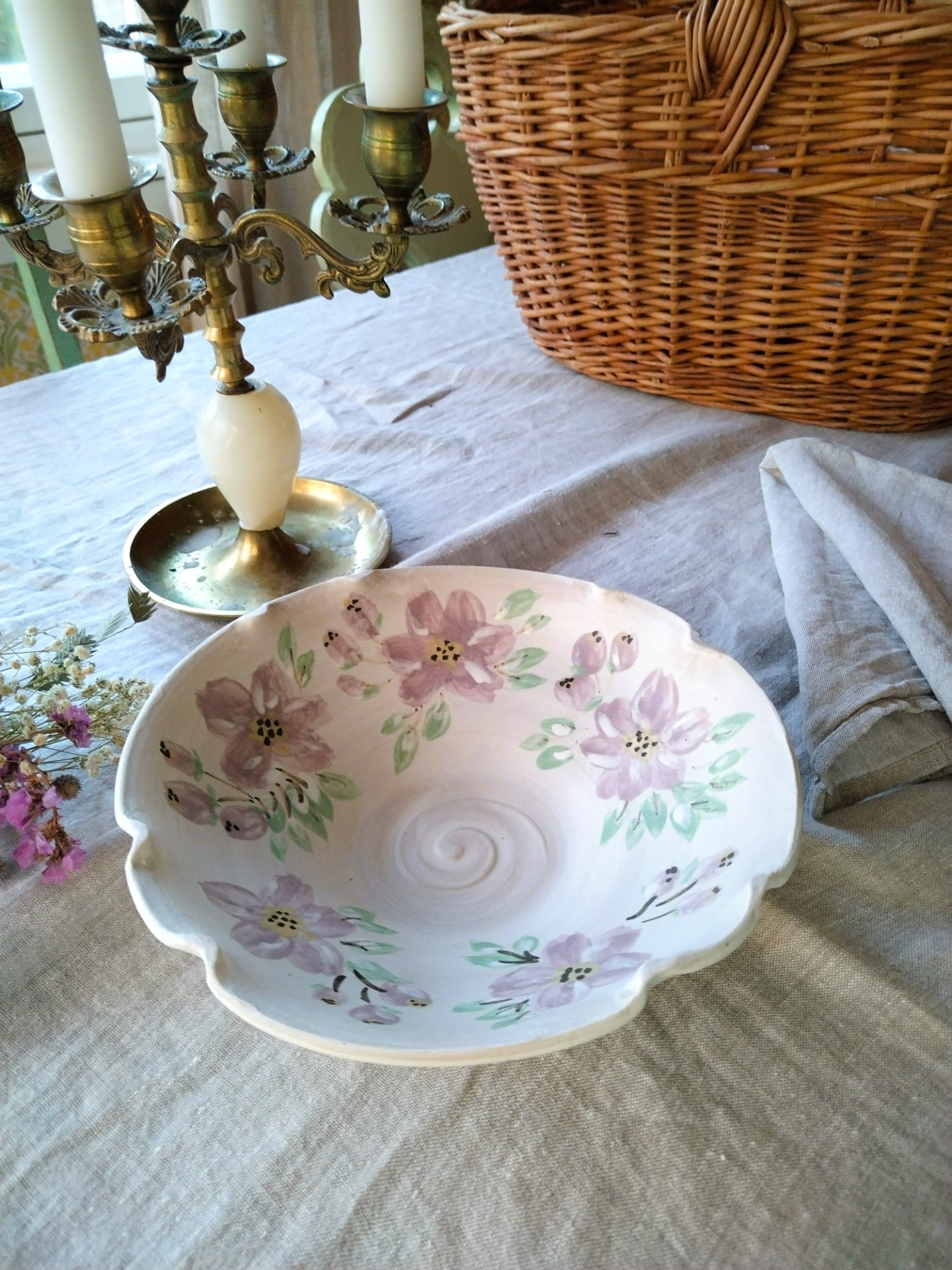 Reilun kokoinen, kaunis, käsin maalattu vati sisustukseen tai vaikka hedelmille. Lasite on himmeä ja hieman karkea ja siksi se ei sovellu elintarvikeastiaksi.