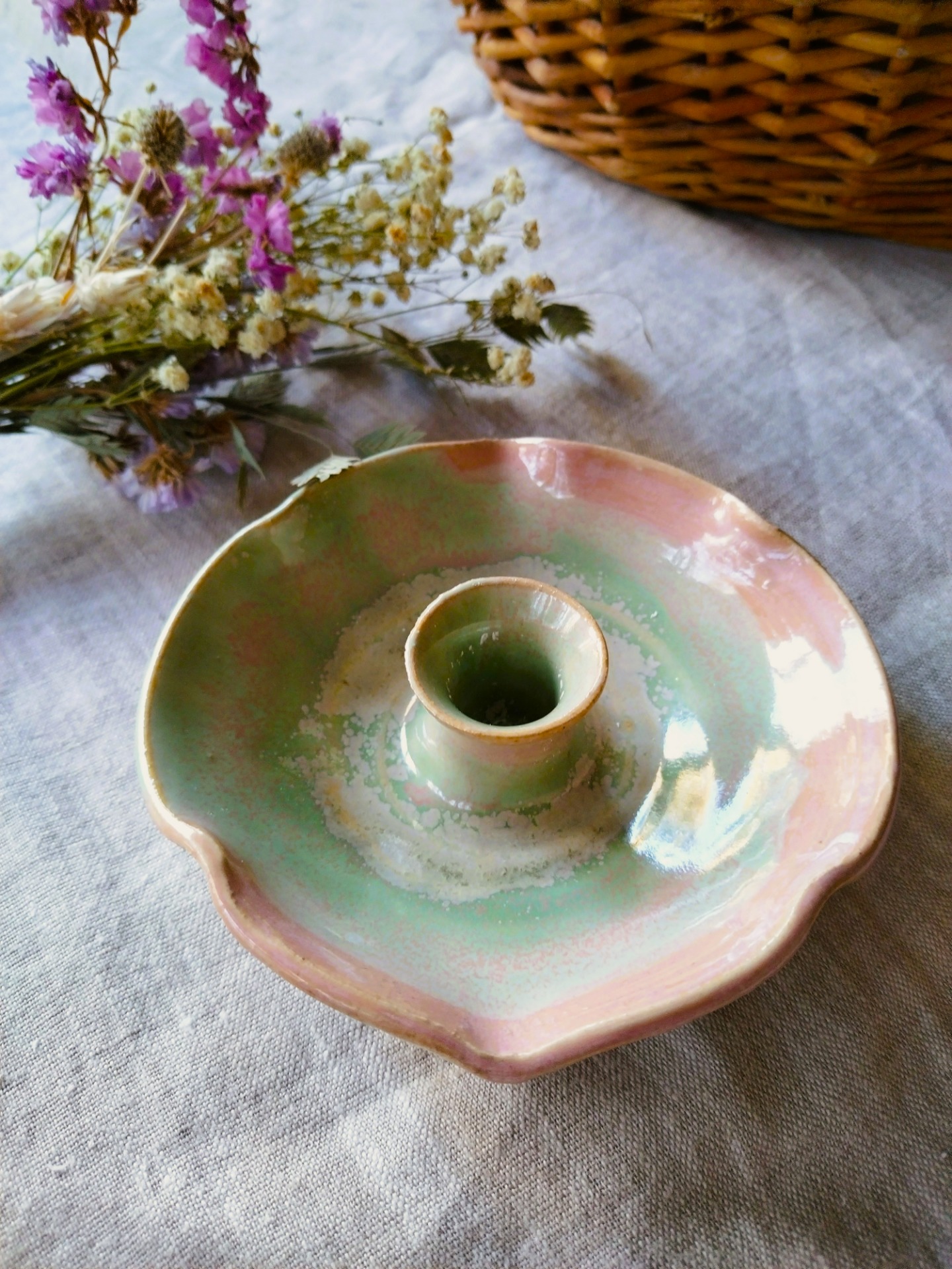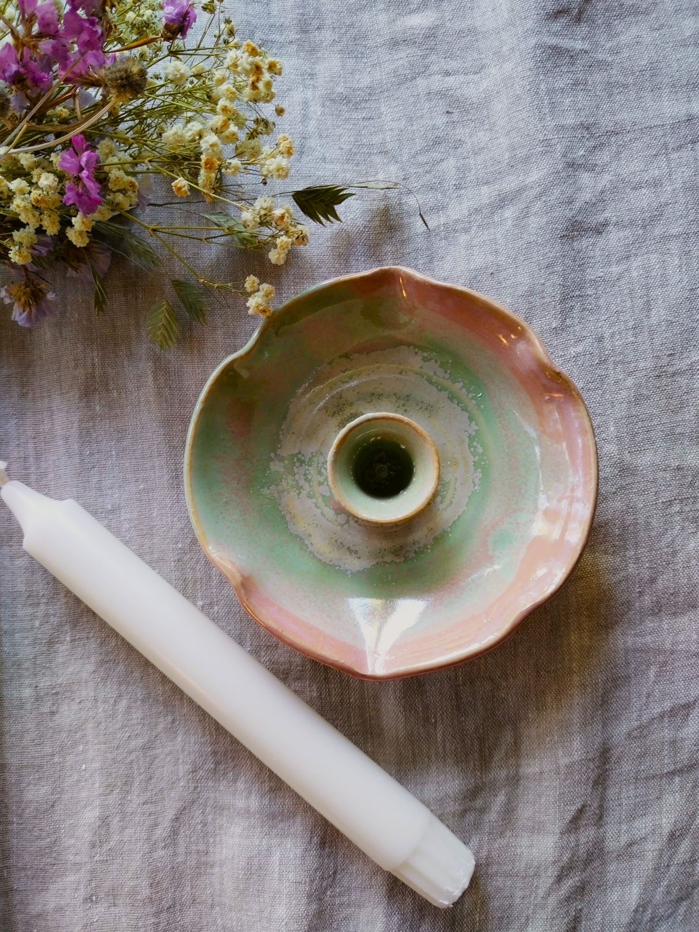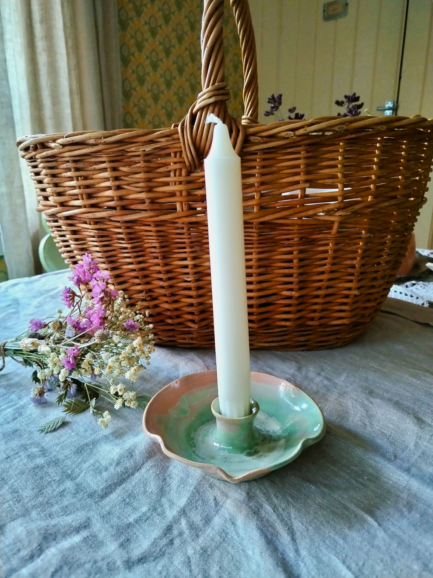 Nupulla kynttilänjalka on käsintehty kynttilänjalka ruokapöydän kattaukseen ja hämärtyviin iltoihin. Vaaleanpunainen lasite yhdistyessään vaniljaisen vaalean kanssa, muodostaa kauniita kuvioita astian pohjaan. Lasitteet tekevät näin jokaisesta esitteestä ainutlaatuisen yksilön.