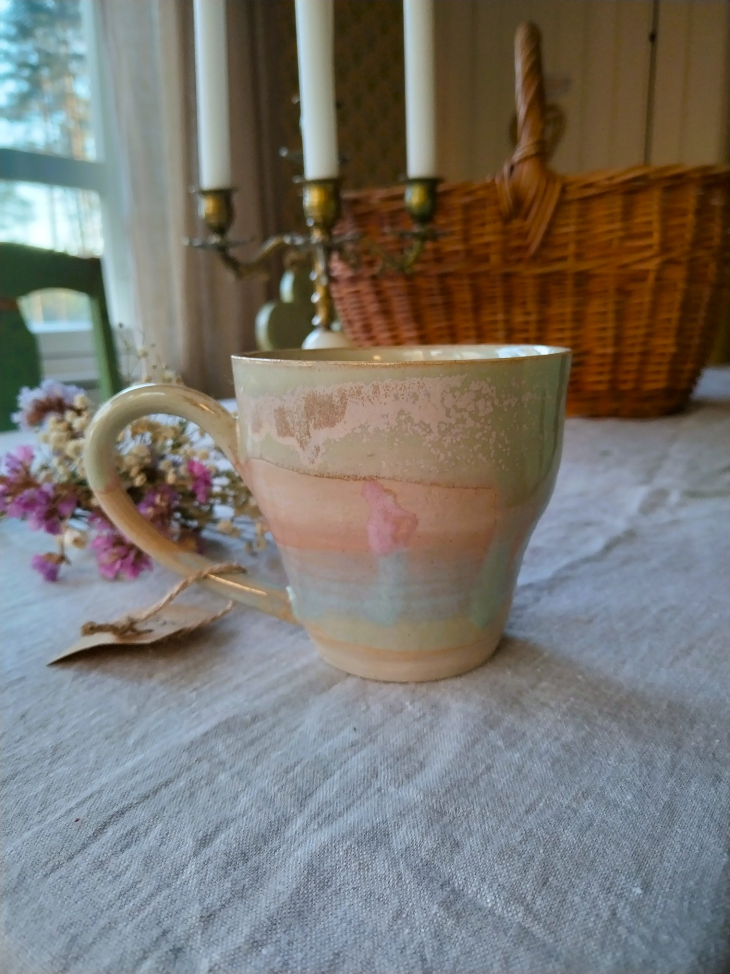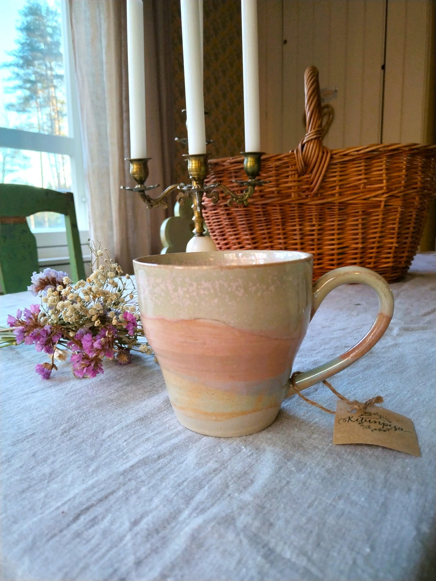 Ketunpesän mukit ovat kaikki yksilöllisiä huokuen entisajan tunnelmaa. Muki on käsin dreijattu, hitaasti ja lempeydellä. Sen kaareva muoto ja suuri kahva tekevät siitä mitä ihanteellisimman seuralaisen hitaisiin aamuihin.