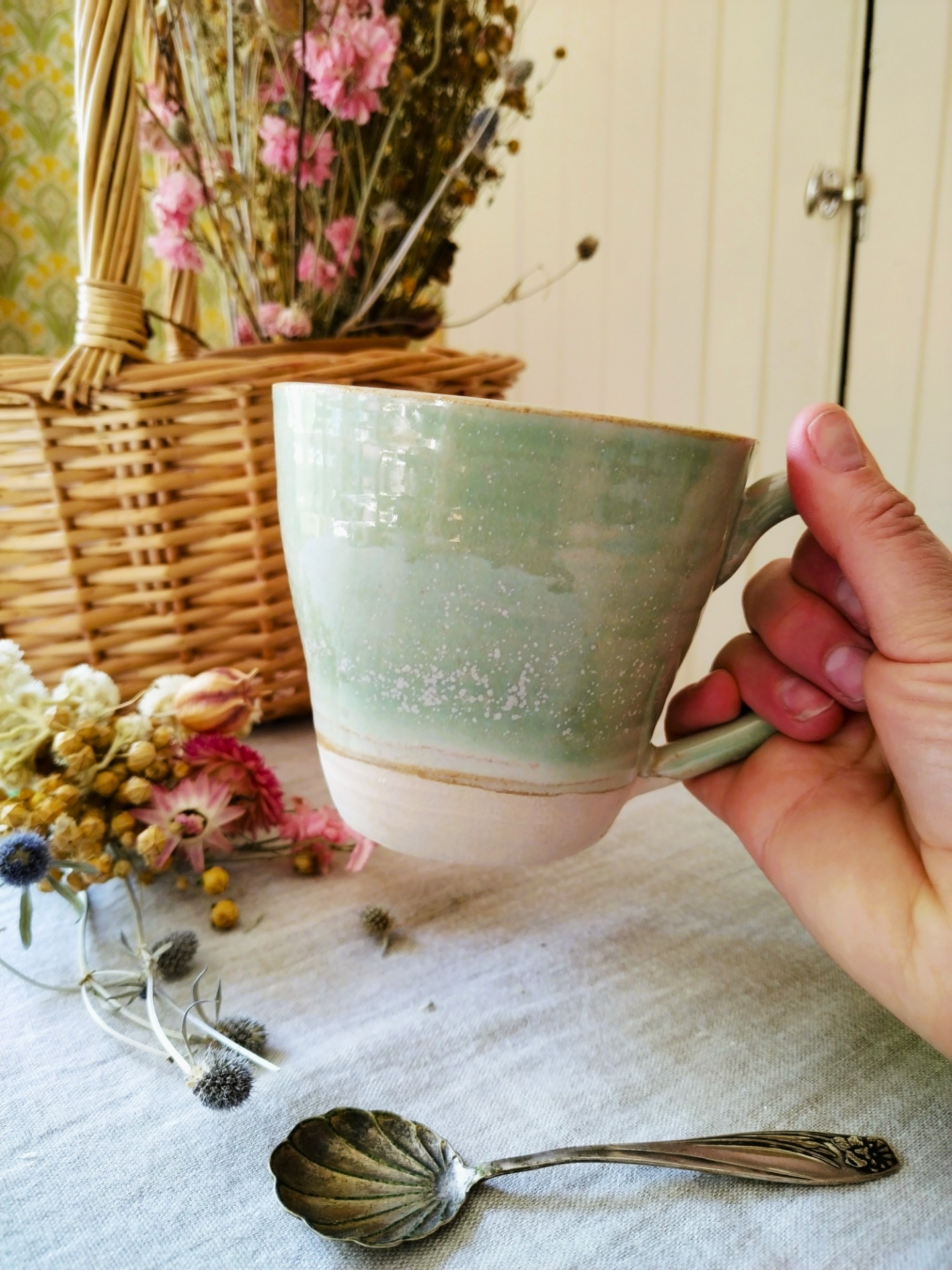 Ketunpesän mukit ovat kaikki yksilöllisiä huokuen entisajan tunnelmaa. Muki on käsin dreijattu, hitaasti ja lempeydellä. Sen kaareva muoto ja suuri kahva tekevät siitä mitä ihanteellisimman seuralaisen hitaisiin aamuihin.