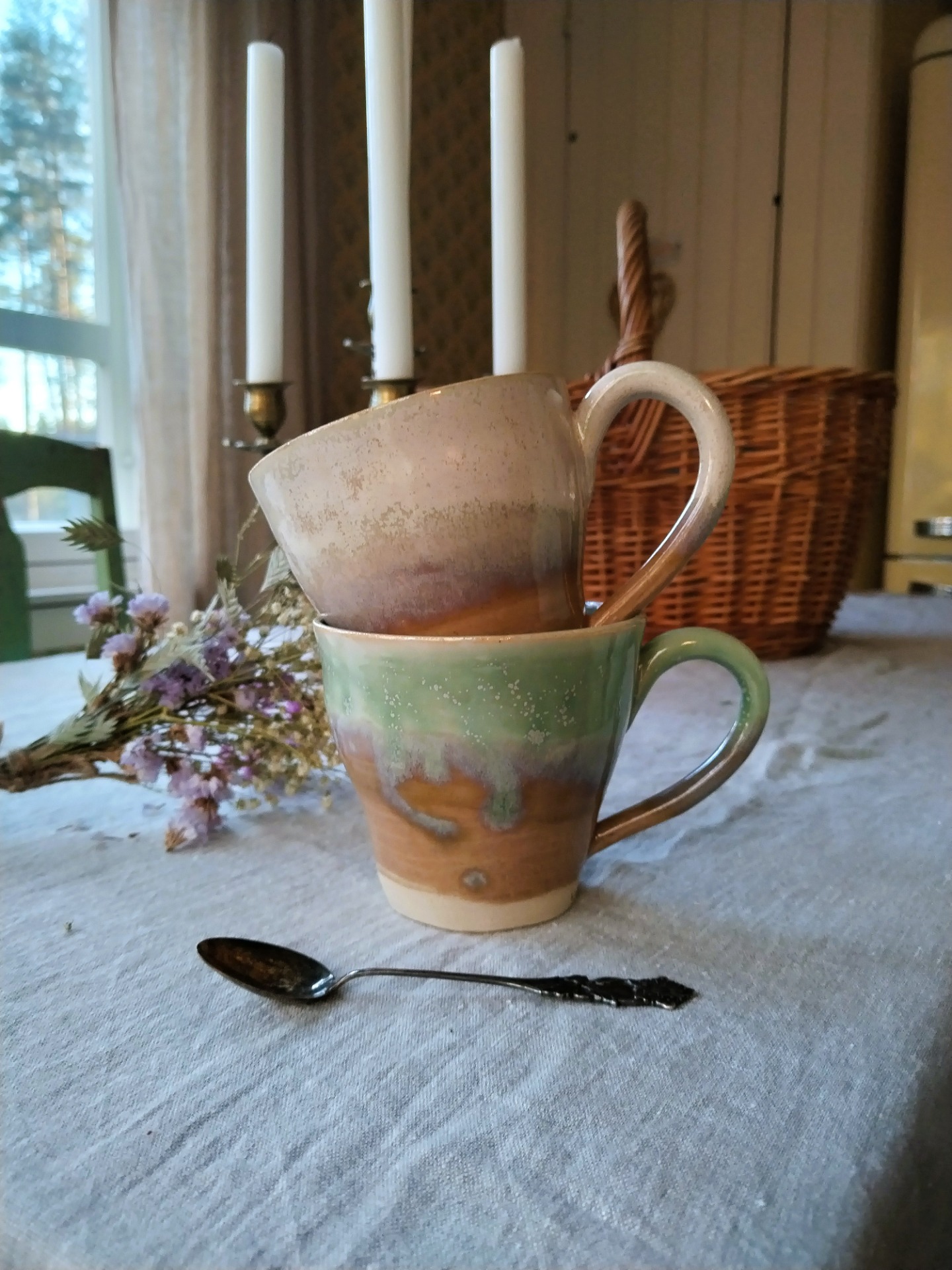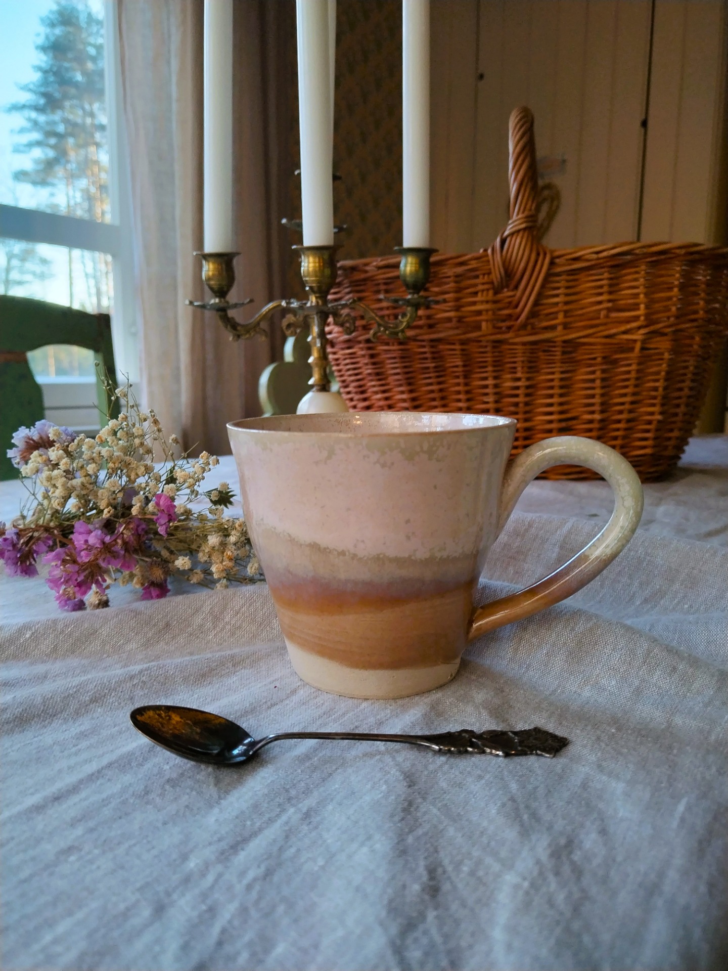 Ketunpesän Onnellinen muki huokuu lempeää entisajan tunnelmaa. Se on käsin dreijattu, hitaasti ja lempeydellä. Sen kaareva muoto ja suuri kahva tekevät siitä mitä ihanteellisimman seuralaisen hitaaseen aamuun.