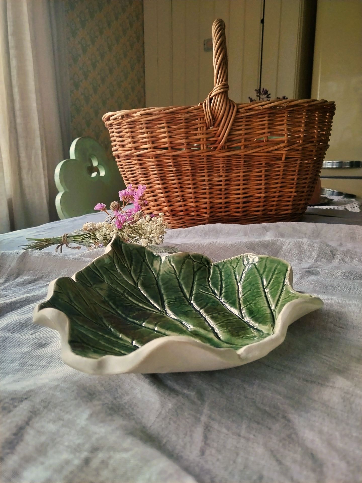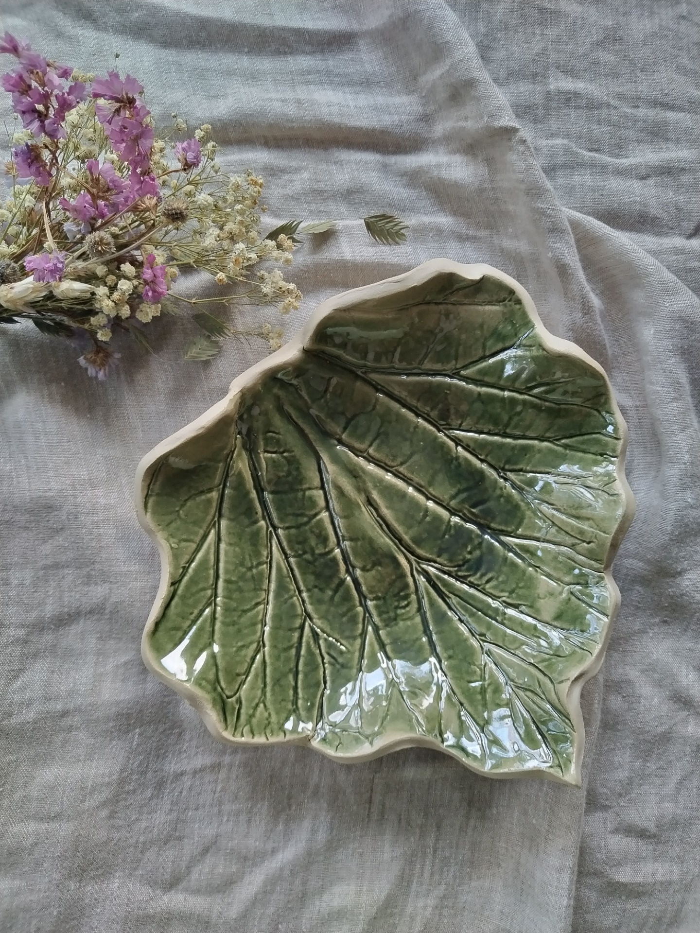 Suurehko, aidosta raparperinlehdestä muotonsa saanut tarjoiluvati sopii niin kattaukseen kuin sisustukseenkin. Kuusi on kiiltävä, hieman läpikuultava tummanvihreä lasite.