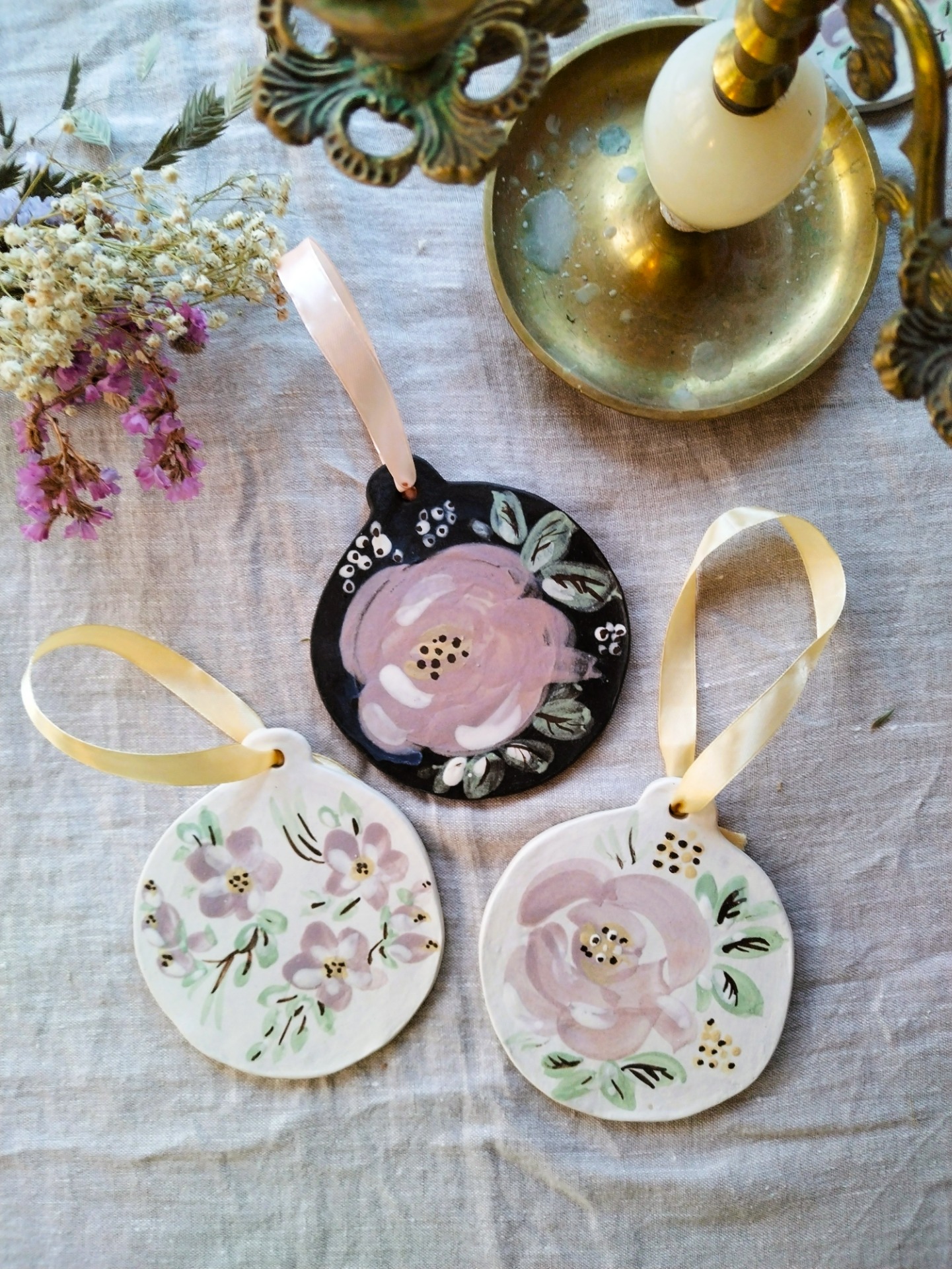 Ketunpesän, käsintehty ja -maalattu kukkakoriste. Koristeen lasite on himmeä ja hieman karkea