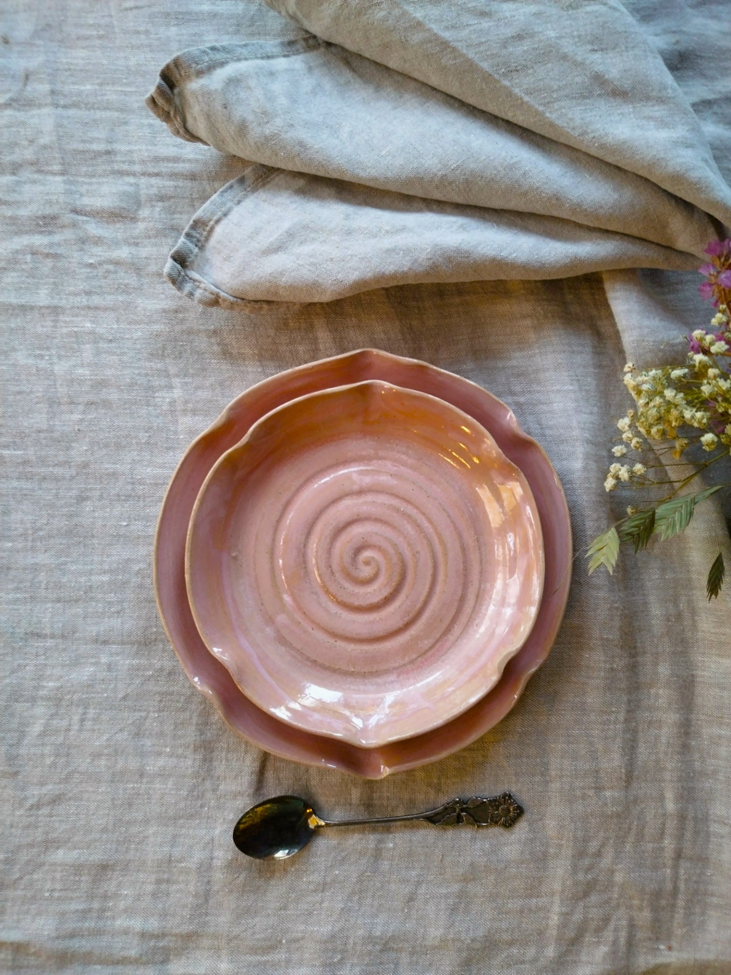 Vadelma on vaaleanpunainen lasite, joka vaihtelee valkeiden ja rusehtavien sävyjen kanssa tuoden jokaiseen astiaan ainutlaatuisen sävyn.